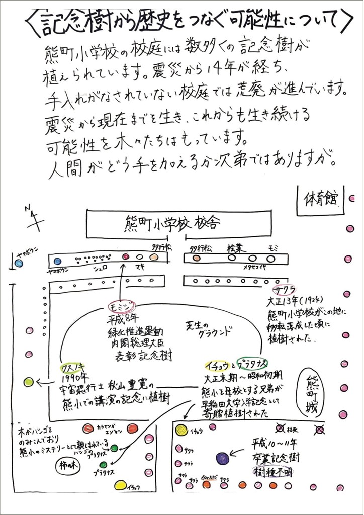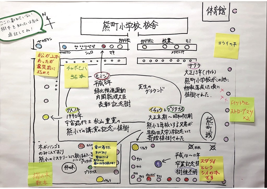 来館者の皆さまに、熊町小学校校庭の樹木マップへコメントいただきました。