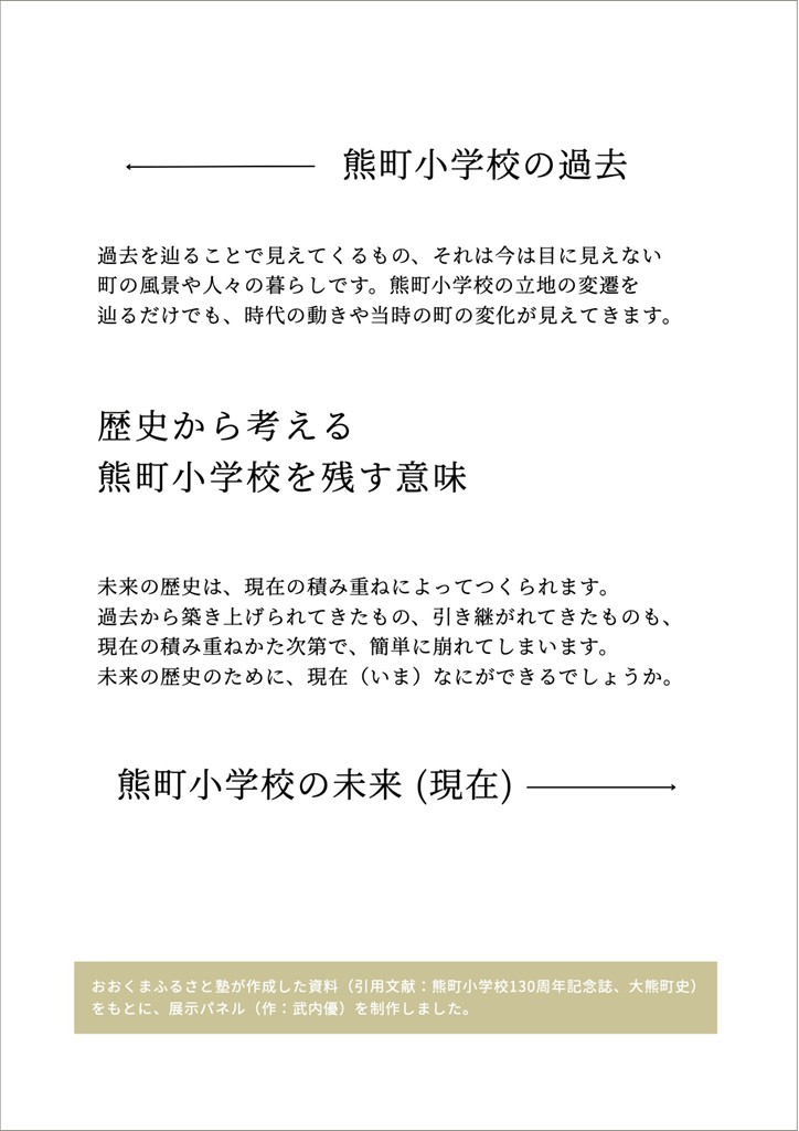 パネル展示「熊小がある。これまでも、これからも。~未来にのこしたい、わたしたちの学び舎~」は、CREVAおおくまにて9月より約1カ月開催させていただきました。CREVAおおくまのスタッフの皆さまには、開館間もない時期にも関わらず、快くご対応いただきました。誠にありがとうございました。今後も定期的に県内各地で開催予定ですので、改めて告知させていただきます。