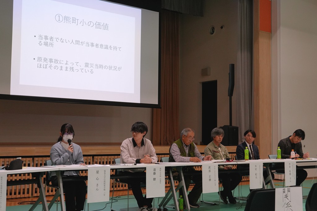 自身が大熊町で語り継ぎプロジェクトに参加していることから、「多くの犠牲者が出たほかの震災遺構と比べ、旧熊町小学校は(下校中に犠牲になった児童もいるが)、比較的、学生が語りやすい場所」と指摘し、次世代が原子力災害の継承を担う場所としての在り方を示唆しました。