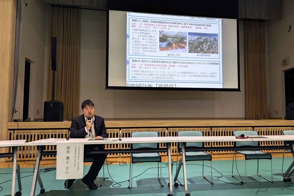 菅井優士さん(大熊町生涯学習課 社会教育係 副主任学芸員)より、大熊町文化財保存活用地域計画の概要と、中間貯蔵施設内の文化財の位置づけをご紹介いただきました。除染にともない景観が大きく変わる中、通常なら「文化財」にならないようなものでも「町の成り立ちのピースとなり得るもの」は収集の対象とし、大熊町文化財保存活用地域計画の検討が進められてきました。現在、計画の策定にむけ、文化庁との協議が進められています(2025年12月19日 文化庁より認定済み)。中間貯蔵施設内の文化財については、文化財的な観点に限らず、様々な視点から検証をし、町民を含めた協議会を立ち上げ、保存活用を検討する方針が示されました。