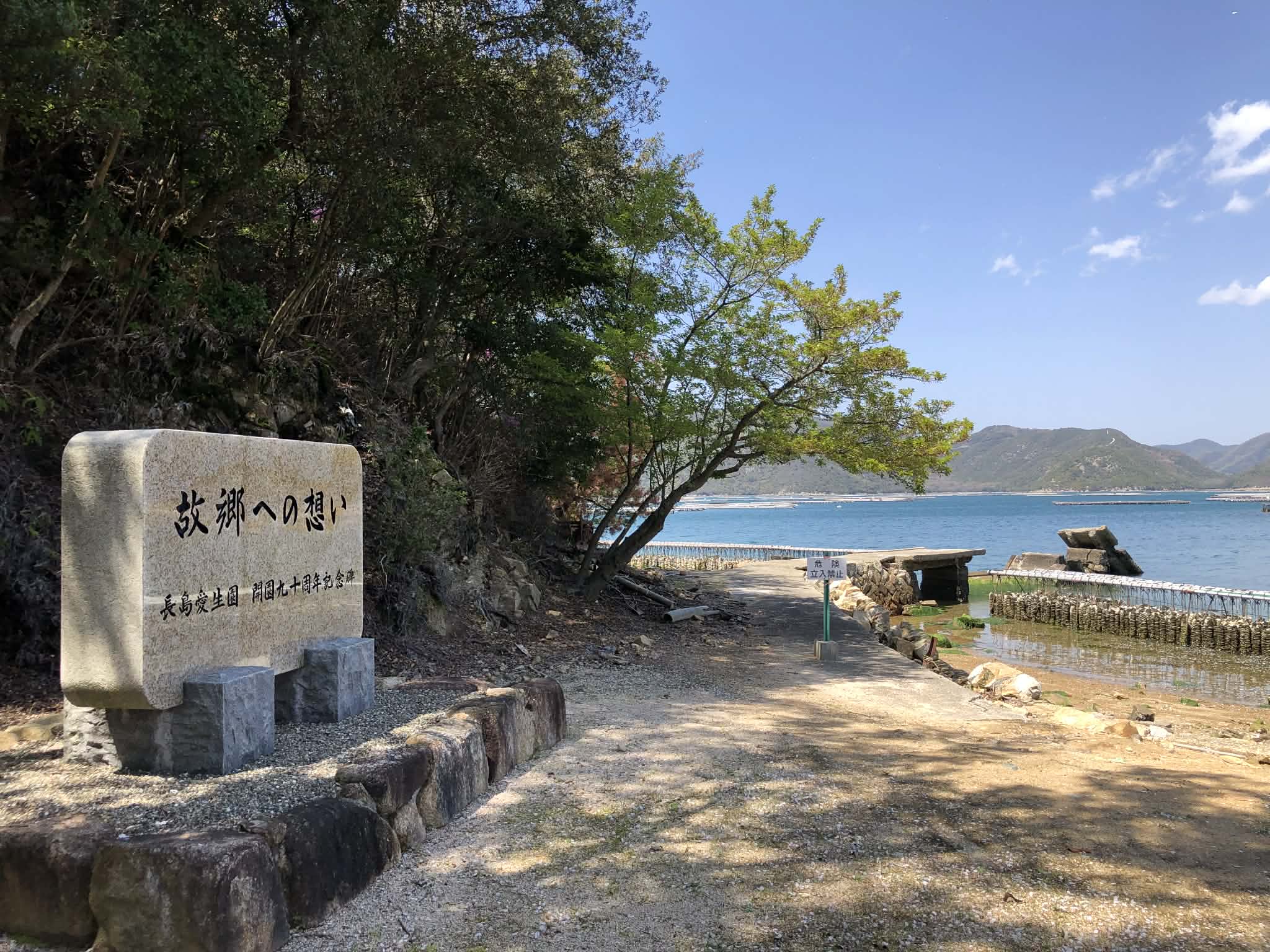 双葉郡に来て以来、「おかしい」と思うことが増え悶々とする中、この数年、木村紀夫さんをはじめとする(一社)大熊未来塾とともに、地域住民や学生たちも交え「記憶の継承」を深く考えるようになった。そのような取り組みから、先日、久しぶりに岡山県瀬戸内市の長島愛生園に足を運んだ。長島愛生園は、1930年(昭和5年)11月に開園した日本初のハンセン病患者の国立療養所だが、当時は有効な治療法がなく、国の政策として隔離が行われていた。これまでも園内の歴史館を訪ね、南側にある桟橋が入所者の語る「社会との決別」を象徴するものだと思っていたが、違うことにやっと気づき、本来の桟橋に向かった。そして、「故郷への想い」と刻まれた石碑(写真4)を目にし、全てがつながることを得心した。