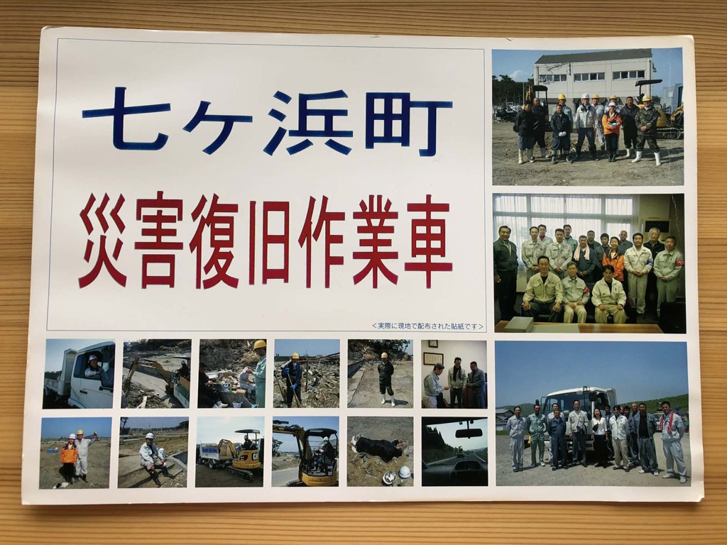 写真1 現地で配布された作業車用の貼紙と仲間たち(写真筆者)