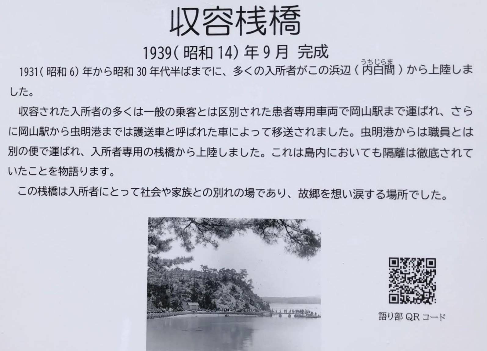 桟橋そばのプレートに説明が記されており(写真6)、QRコードを読み取ると語り部の録画映像が視聴できる。「(桟橋に降り立つことは)社会との決別、家族との別れ」という強制的に長島愛生園へ移住した入居者の声をその場に立ち耳にすると、「隔離」を肌で感じる。わたしたちの歴史を体感することができる。