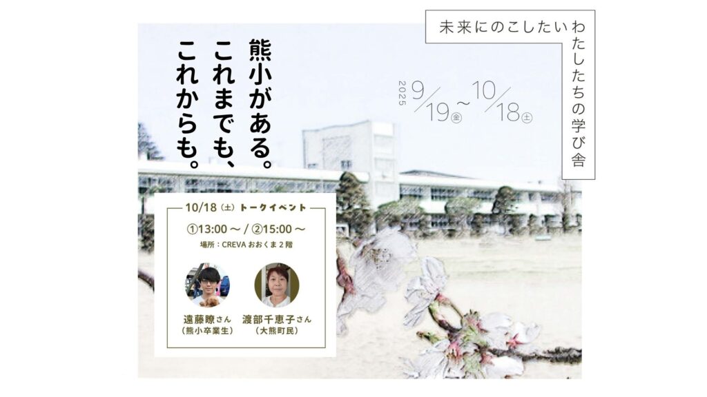 9月より開催しているパネル展示「熊小がある。これまでも、これからも。~未来にのこしたいわたしたちの学び舎~」のパネル作成にかかわった熊小卒業生と、大熊町民のトークイベントを行います。